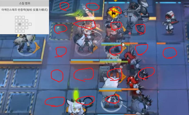 빨간색으로 동그라미 친곳이 안젤리나가 3스킬을 사용했을때 공격할수 있는 범위입니다.