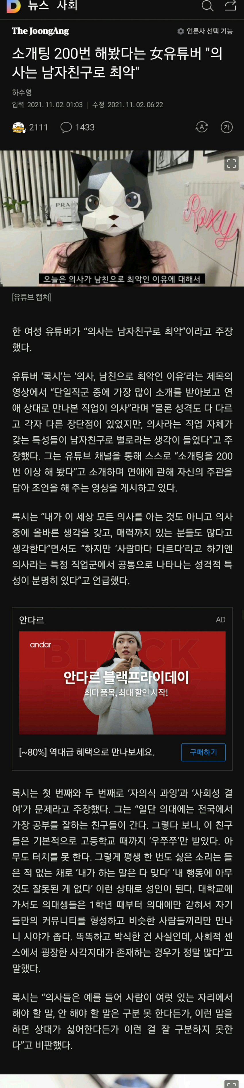 소개팅 200번 해본 여성유튜버가 "의사는 남자친구로 최악"