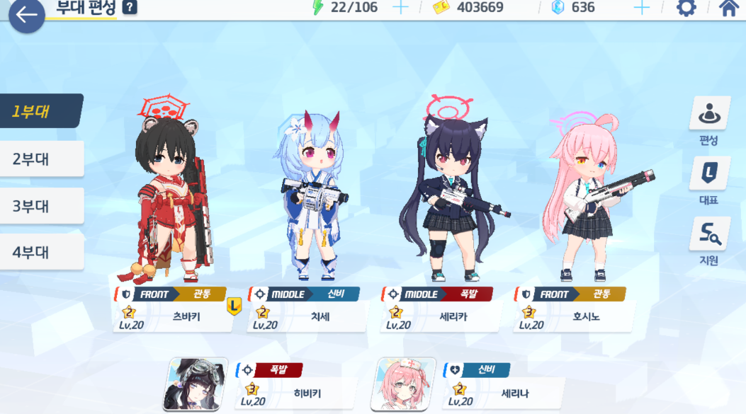 초반에는 1부대 => 메인캐릭터 몰빵 하는게 좋다.