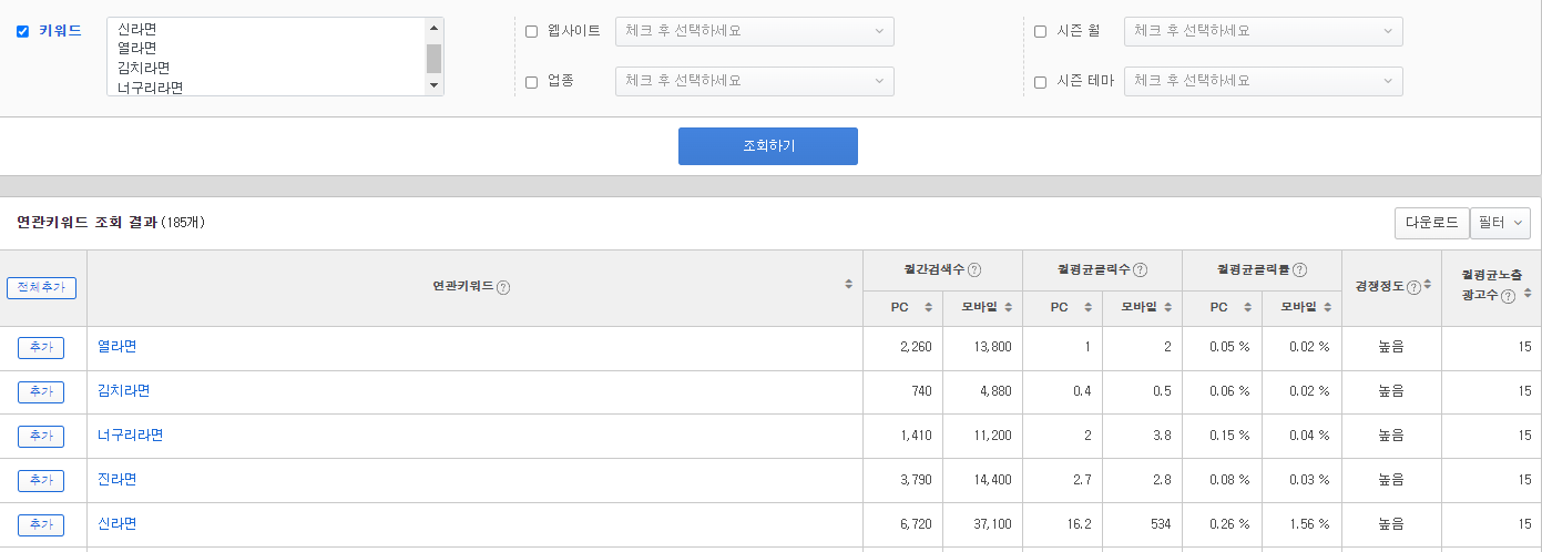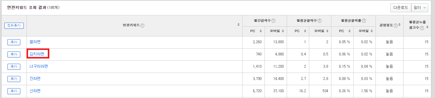 김치라면과 너구리라면은 월간검색수가 1000가깝거나 그 아래입니다.
