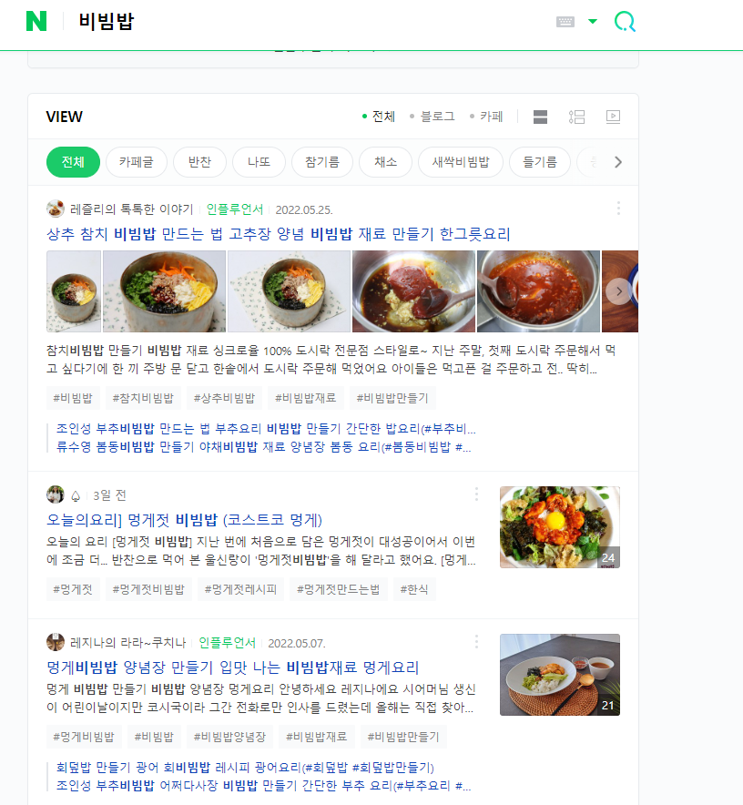 비빔밥이 검색수도 높고 검색순위도 높은 키워드라고 합시다.