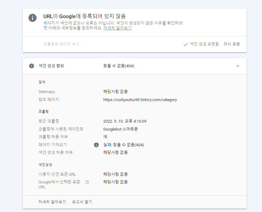 색인 생성 범위 => 제외됨 => 찾을수 없음
