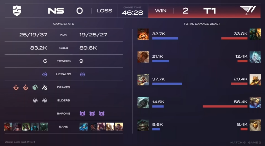 KDA NS(25 / 19 / 37) VS T1(19 / 25 / 27)