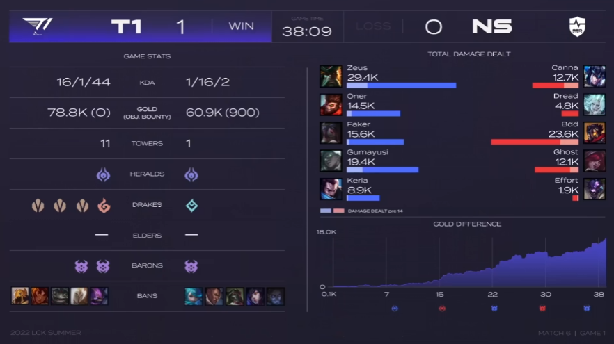 KDA T1(16 / 1 / 44) VS NS(1 / 16 / 2)