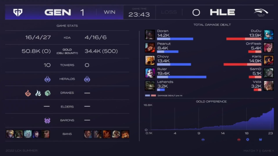 KDA GEN(16 / 4 / 27) VS HLE(4 / 16 / 6)