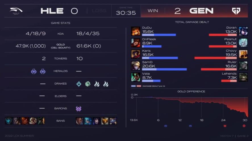 KDA HLE(4 / 18 / 9) VS GEN(4 / 16 / 6)