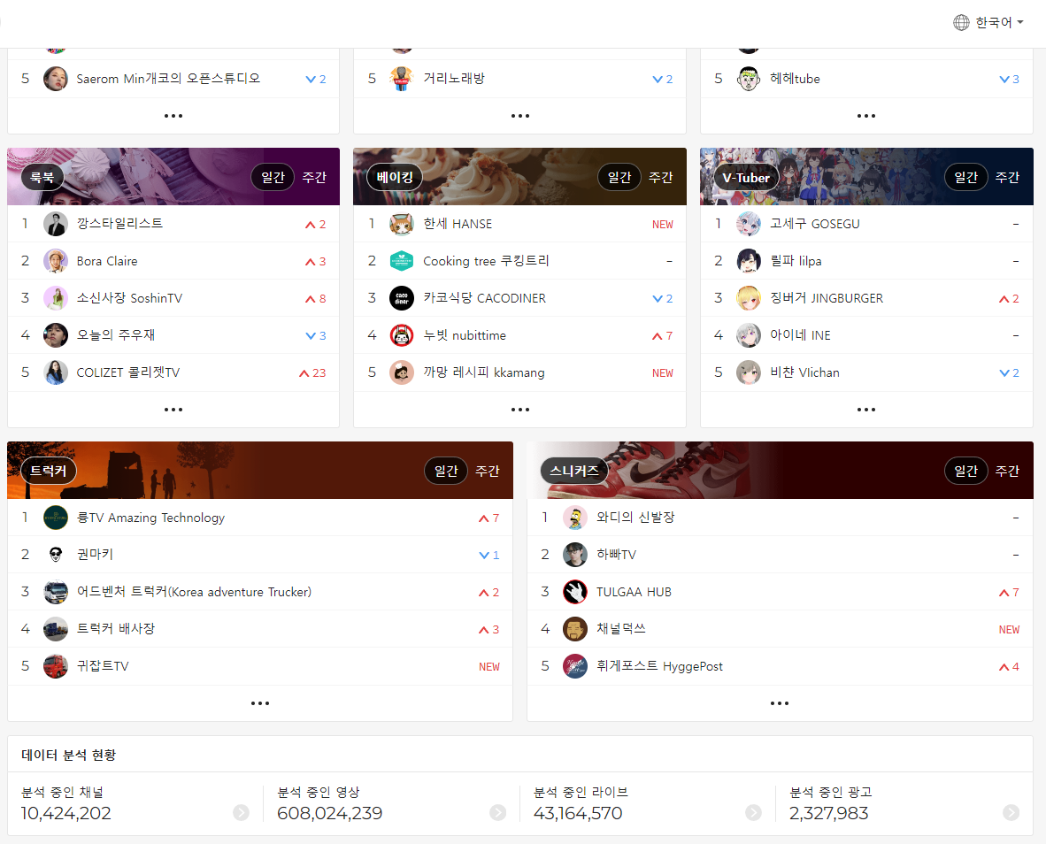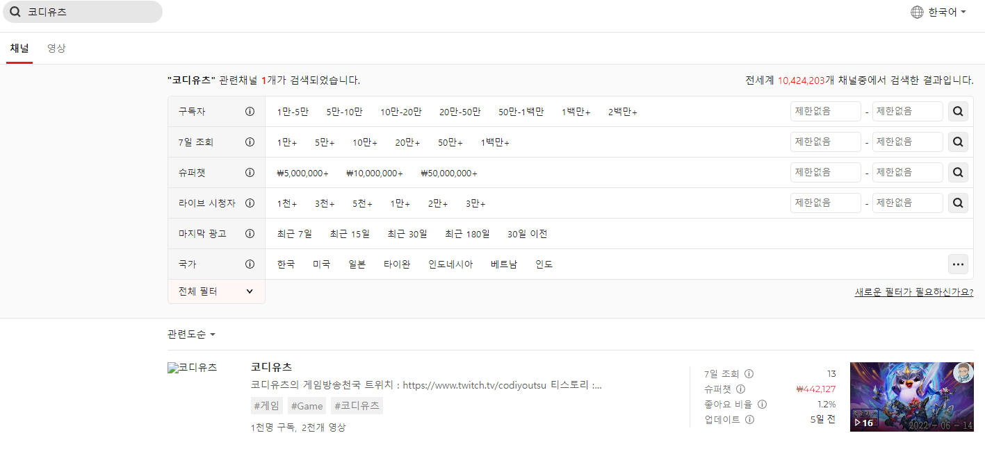 전세계 1천만 유튜브 채널 검색 분석 사이트