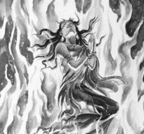 남편의 시체 옆에서 같이 불타는 장래를 치르게 된다.
