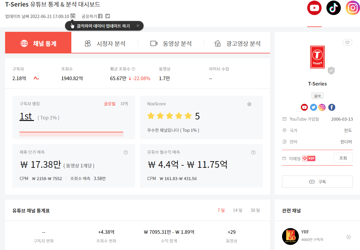 맨위의 T-Series분을 한번 확인해보겠습니다.