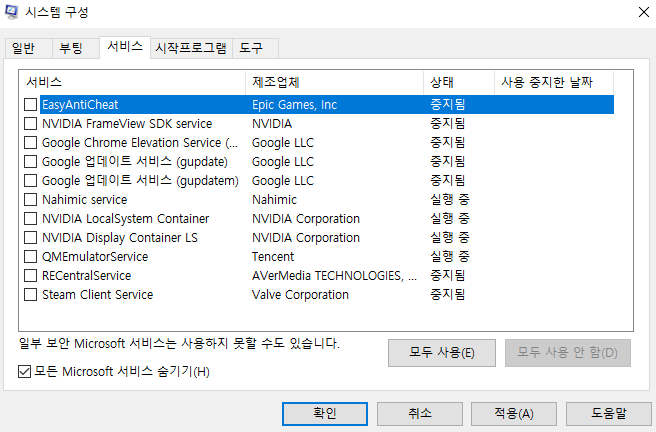 2. 시스템 구성 => 서비스 => 모든 Microsoft 서비스 숨기기 클릭 => 모두 사용 안함 클릭