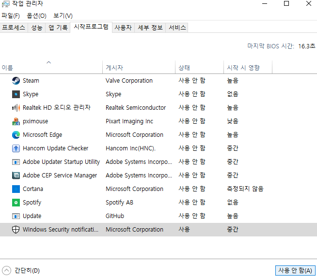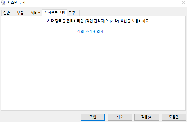 4. 작업관리자 => 시작프로그램 => 항목에 보이는 모든 프로그램을 1개씩 전부 사용 안함으로 변경 =>
