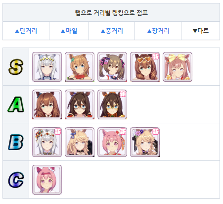 여기에 기록되지 않는 경마 캐릭터는 단거리 + 마일정보에 기록되어 있습니다.