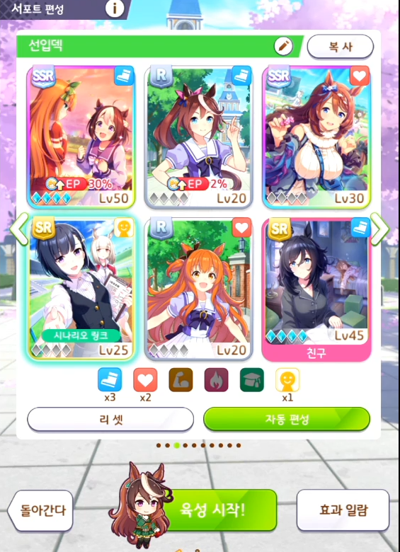 스피드3개 + 파워2개 + 친구1개 => 스태미너 계승 우마무스메 선택하기