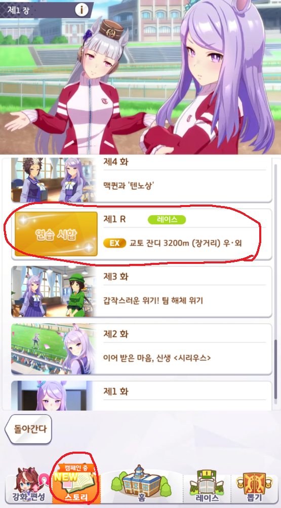 2. 스토리 => 1장 => 레이스 시나리오 => 원하는 말딸 각질 선택후 경기 뛰기
