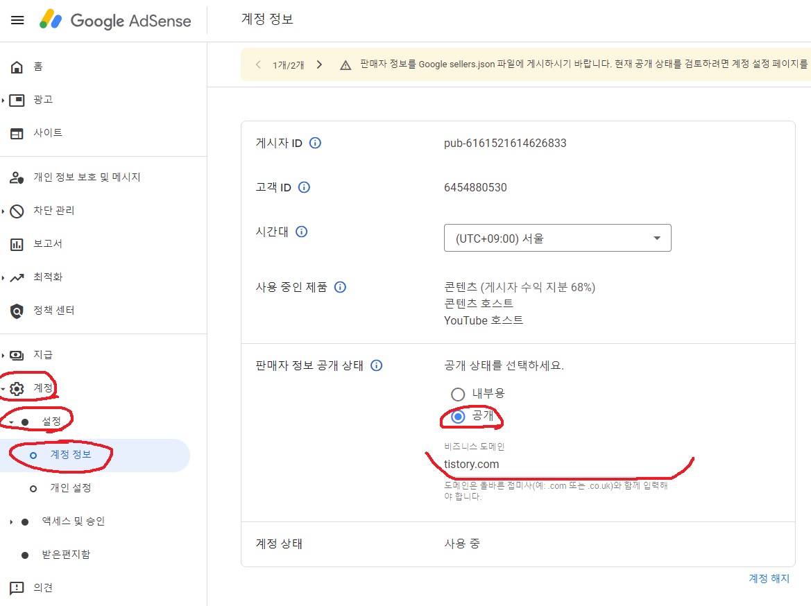 계정 => 설정 => 계정 정보 => 판매자 정보 공개 상태 (공개 설정)