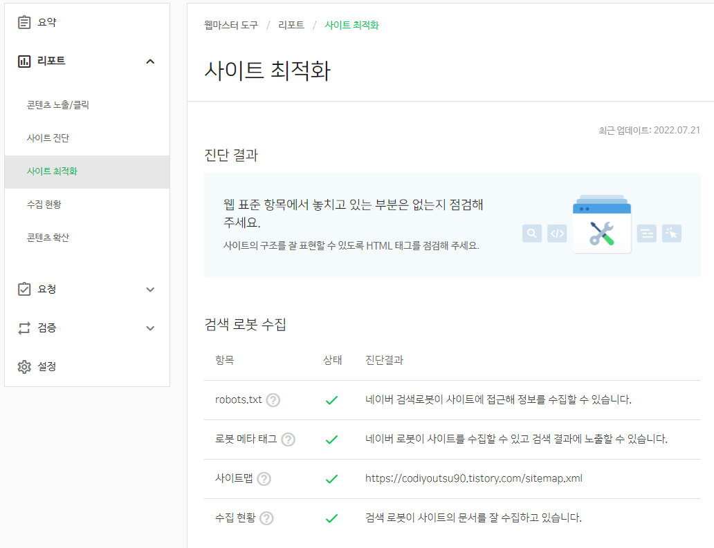 저품질 블로그 지수 확인 진단 사이트 : https://codiyoutsu90.tistory.com/515