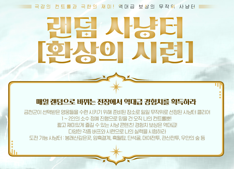 자동사냥 시스템 + 스토리 퀘스트 + 랜덤사냥터 + 환상의 휴가 => 사냥 컨텐츠