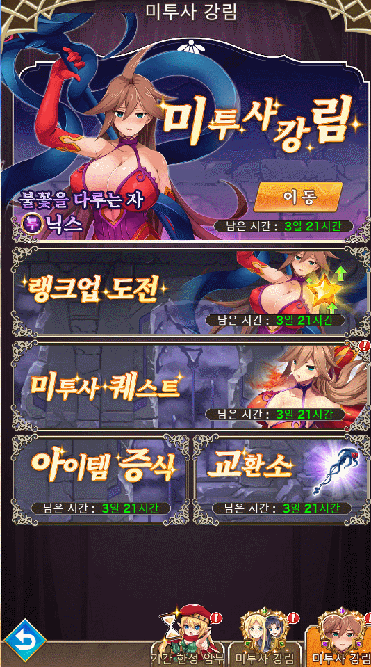 미투사 신전 => 캐릭터 랭크업, 이별(판매), 변환(같은 속성으로 변신)