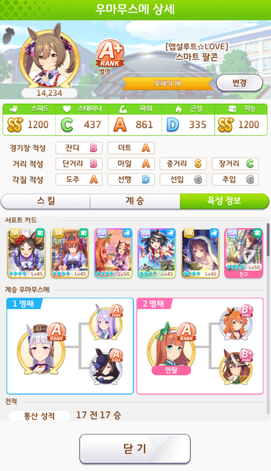 능력치 => 스피드 1200 / 파워 1200 / 지능 1200 / 스태미나 600 / 근성 400 추천