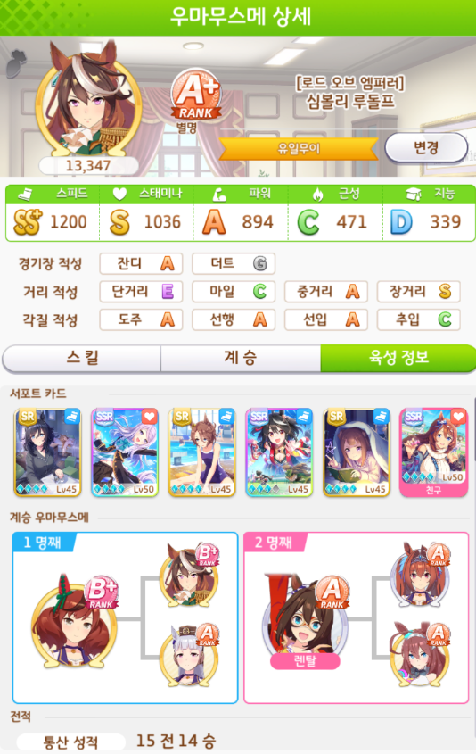 능력치 => 스피드1200 / 스태미나 1200 / 파워 1200 / 근성 400 / 지능 400 추천