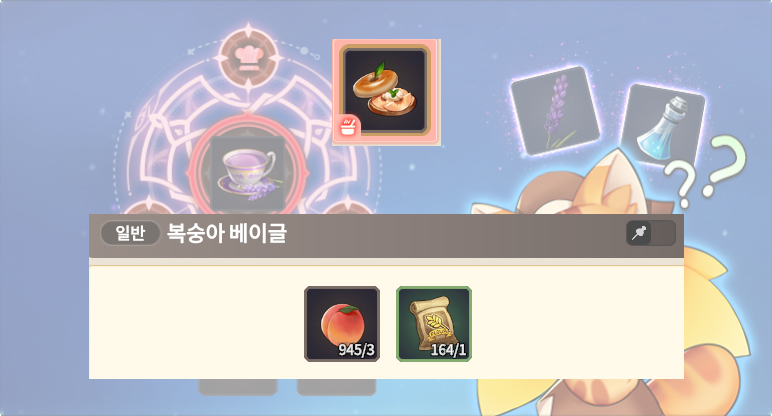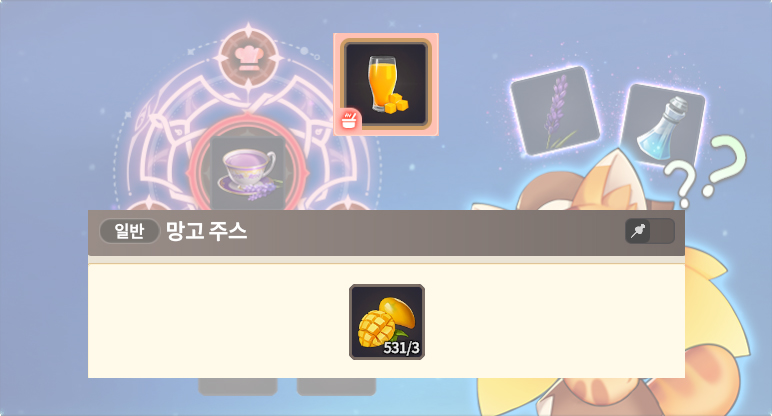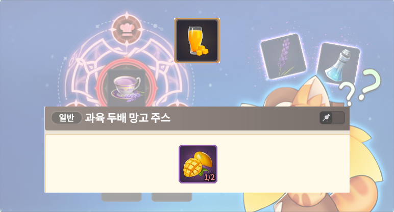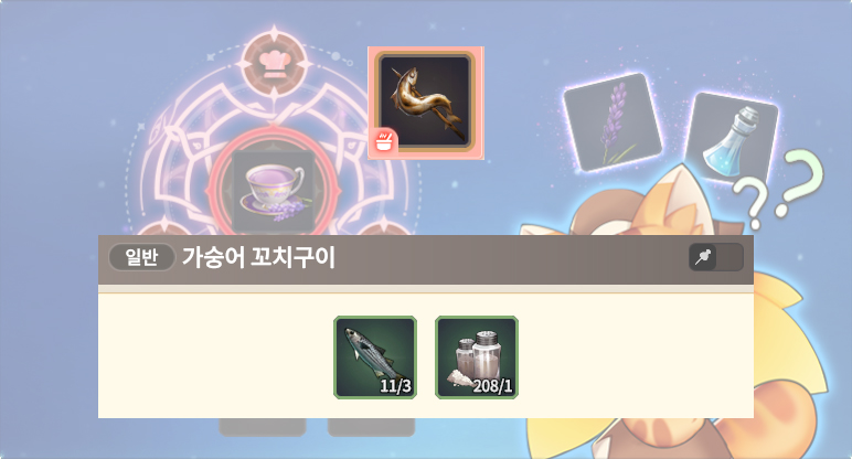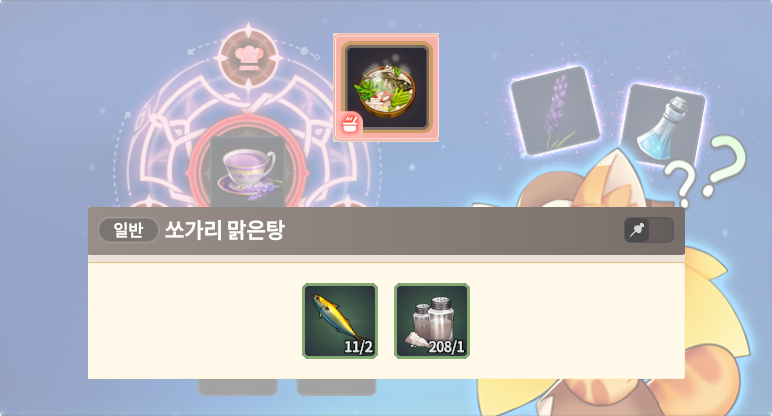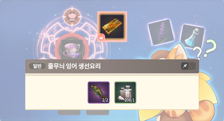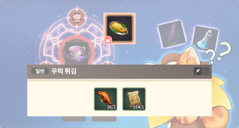 요리 LV2 레시피 꼬치고기 생선요리 꼬치고기 X 4 소금 X 1 타이거 락 피쉬 매운탕 타이거 락피쉬 X 4 후추 X 1 복숭아 주스 복숭아 X 6 천연수 X 1 설탕 X 1 양념 닭튀김 닭고기 X 5 밀가루 X 1 올리브 오