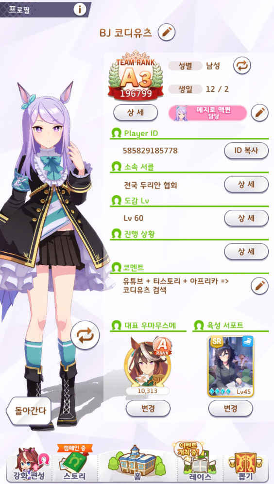 우마무스메 프로필 ID : 585829185778 대표 우마무스메 : 심볼리 루돌프 육성 서포트 : SR 스윕 토쇼 (2022 / 09 / 06 업데이트) 계승 우마무스메 심볼리 루돌프(대표) 스태미나3 / 잔디2 / 고유스킬2 텐노상(