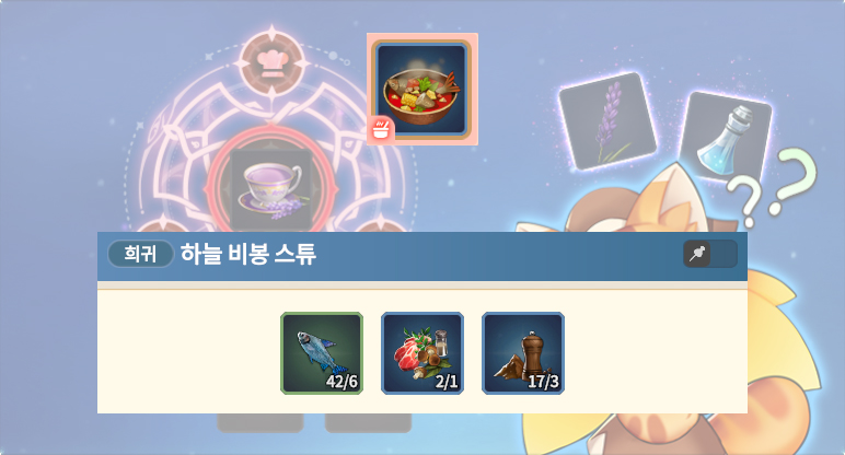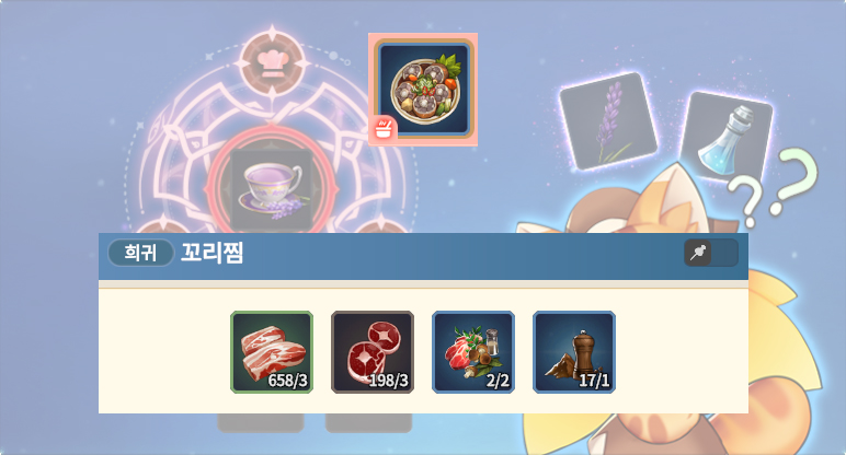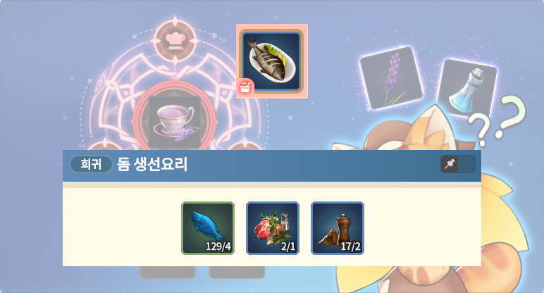 요리 LV3 레시피 연어 생선요리 연어 X 4 손칼민어 X 1 소금 X 2 배스 맑은탕 큰입배스 X 6 후추 X 2 갈비찜 주먹고기 X 6 일반 만능 식재료 X 1 (바질 잎사귀1 / 주먹고기1 / 송어1) (복숭아1 / 주먹고기1 /.