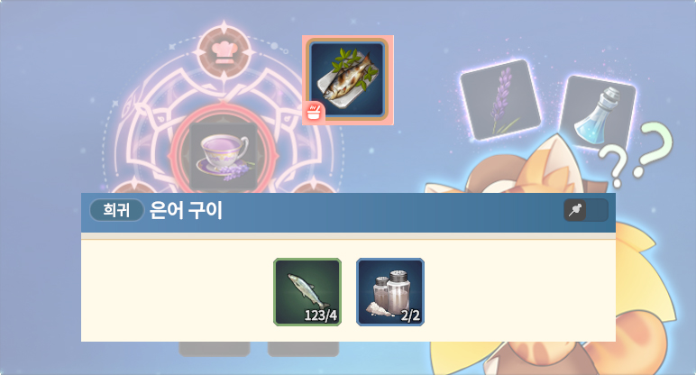 요리 LV5 레시피 동자개 생선요리 동자개 X 5 일반 만능 식재료 X 2 (바질 잎사귀1 / 주먹고기1 / 송어1) (복숭아1 / 주먹고기1 / 연어1) 후추 X 3 꺼끌복 맑은탕 꺼끌복 X 6 일반 만능 식재료 X 1 (바질 잎