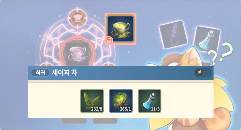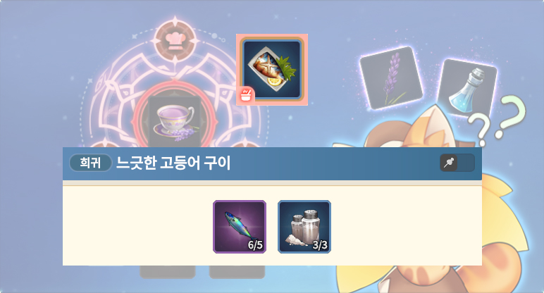 요리 LV6 레시피 은빛 정어리 고급 생선요리 은빛 정어리 X 3 고급 만능 식재료 X 1 (세이지 잎3 / 쇠고기1 / 꺼끌복1) (사프란 꽃잎3 / 쇠고기1 / 무지개고등어1) 최고급 소금 X 1 (캐모마일 꽃봉오리5 /
