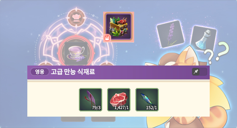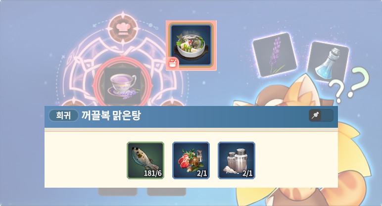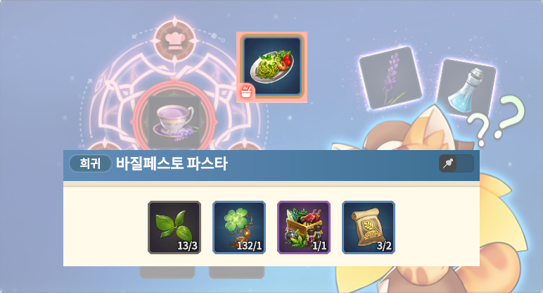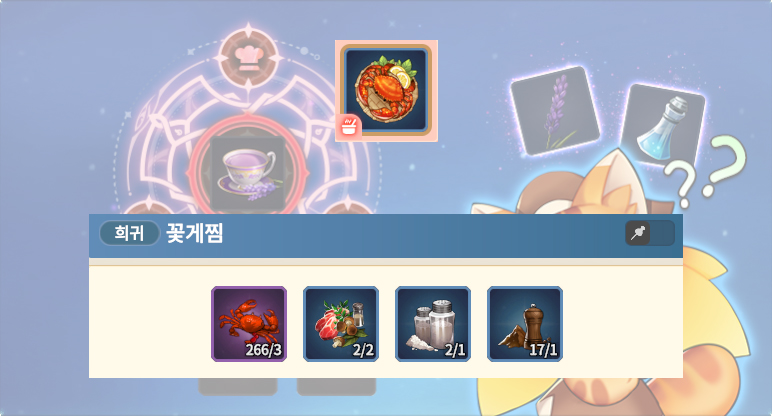 요리 LV4 레시피 돔 생선요리 하늘비늘돔 X 4 일반 만능 식재료 X 1 (바질 잎사귀1 / 주먹고기1 / 송어1) (복숭아1 / 주먹고기1 / 연어1) 후추 X 2 하늘 비봉 스튜 하늘 비봉 X 6 일반 만능 식재료 X 1 (바질