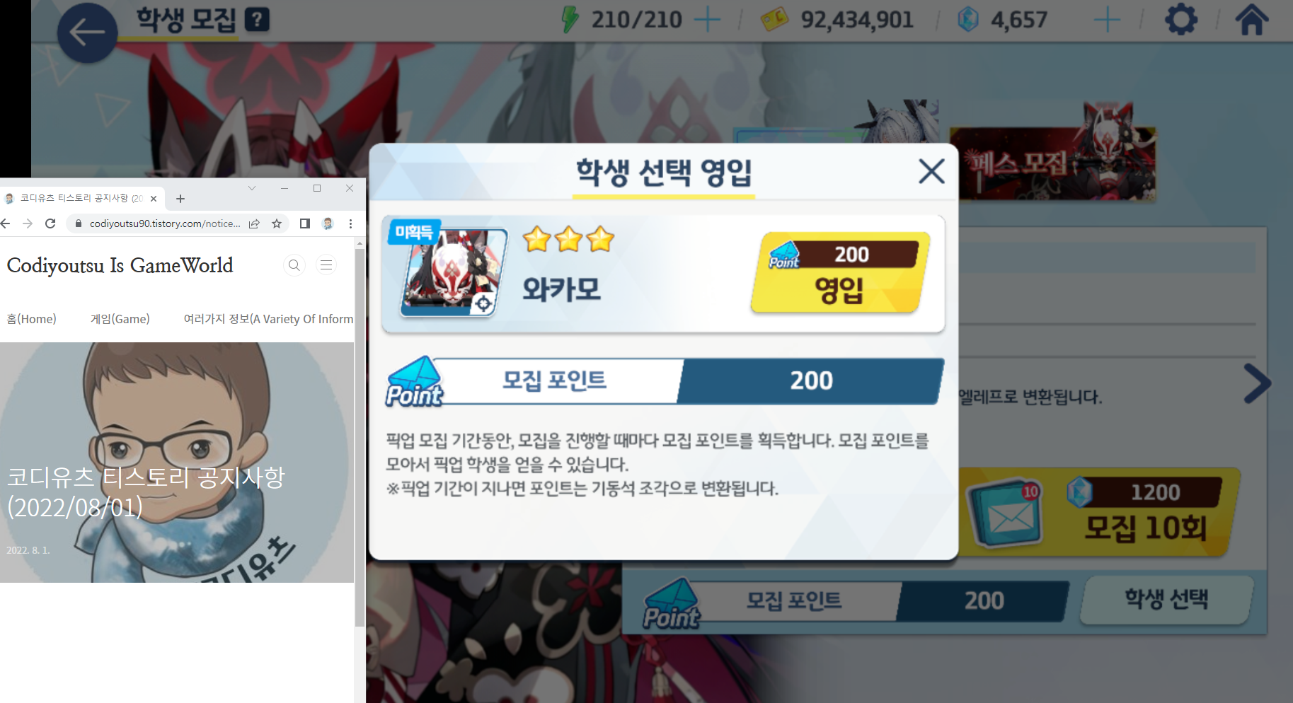 와카모 최소 못해도 1개 ~ 2개정도 먹을 기대감에 뽑기를 시작했습니다. (1천장=200연차 기준)