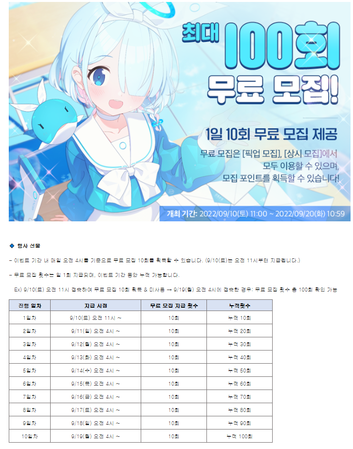 이벤트 기간 내 매일 오전 4기를 기준으로 무료 모집 10회를 획득할 수 있습니다