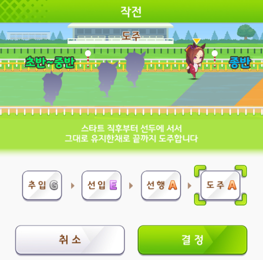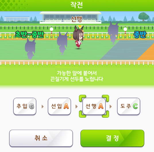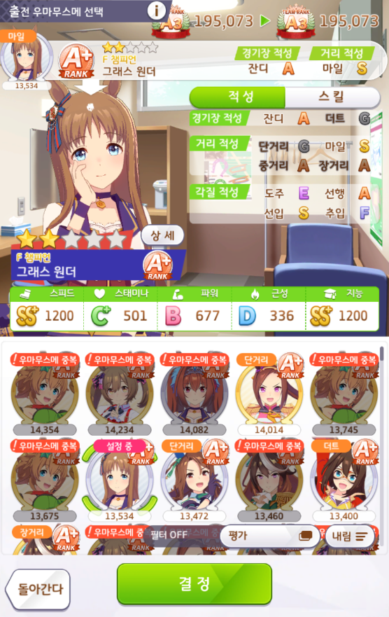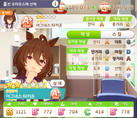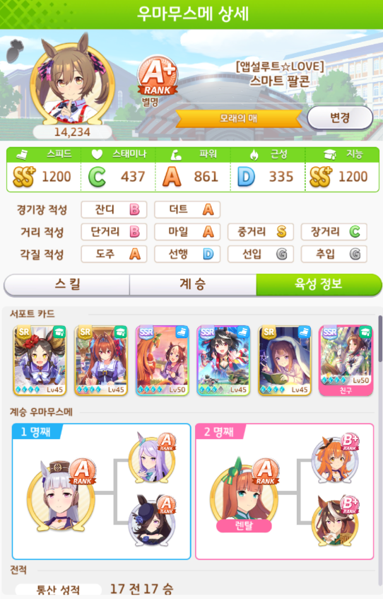 스피드 1200 / 스태미나 600~900 / 파워 600~900 / 근성 400 / 지능 600~900 맞춰줍시다.