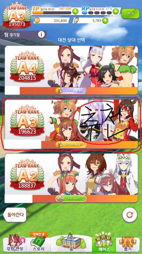팀 레이스는 대전 상대 선택에 따라서 보너스 점수 효과가 있습니다.