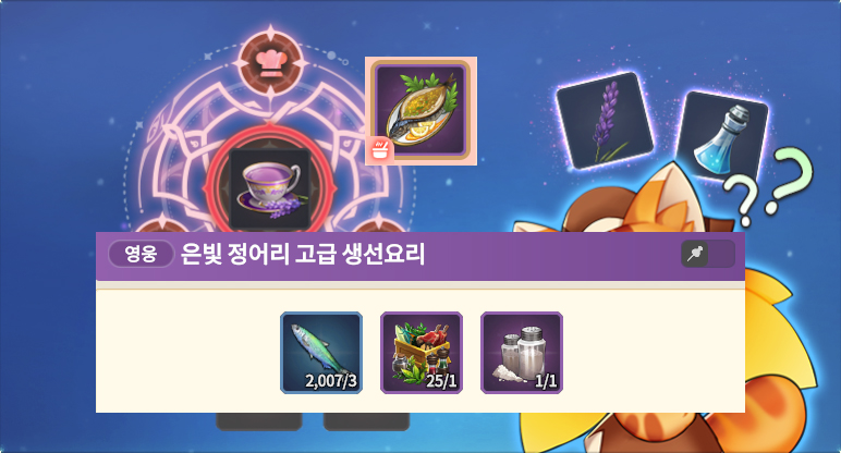 요리 LV7 레시피 스왈로우테일 고급 생선요리 세이지 잎 X 6 스왈로우테일 X 4 고급 만능 식재료 X 2 (세이지 잎3 + 소고기1 + 꺼끌복1) (사프란 꽃잎3 + 소고기1 + 무지개고등어1) 최고급 소금 X 2 (캐모