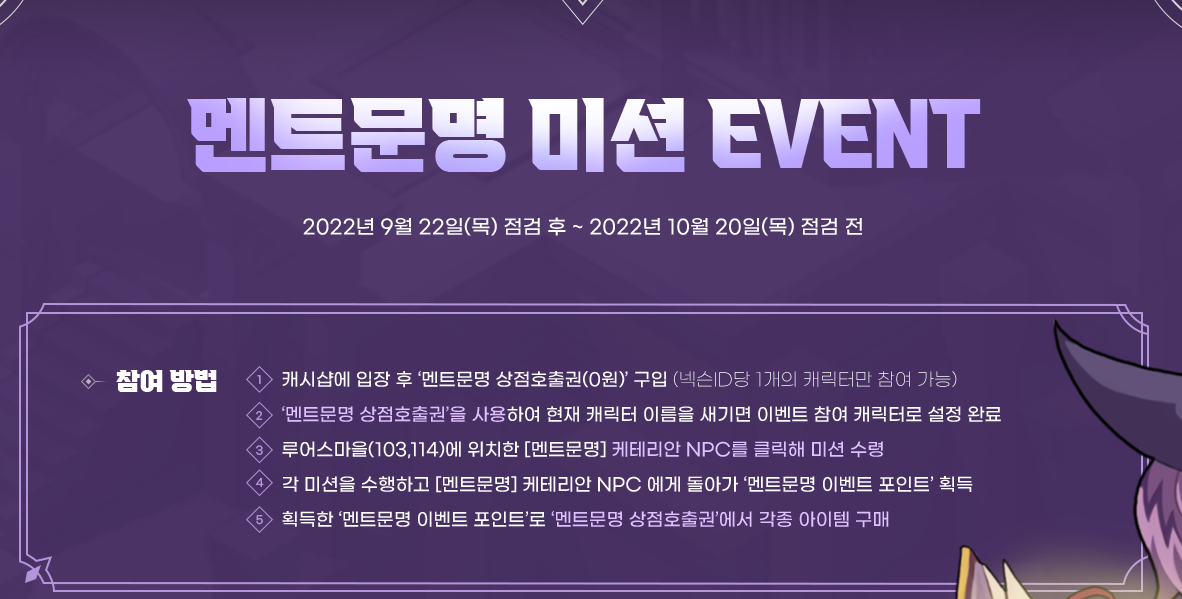 2. '멘트문명 상점호출권'을 사용하여 현재 캐릭터 이름을 새기면 이벤트 참여 캐릭터로 설정 완료