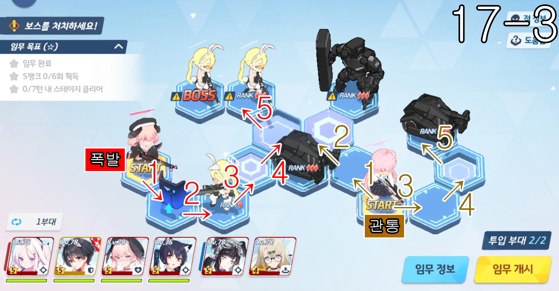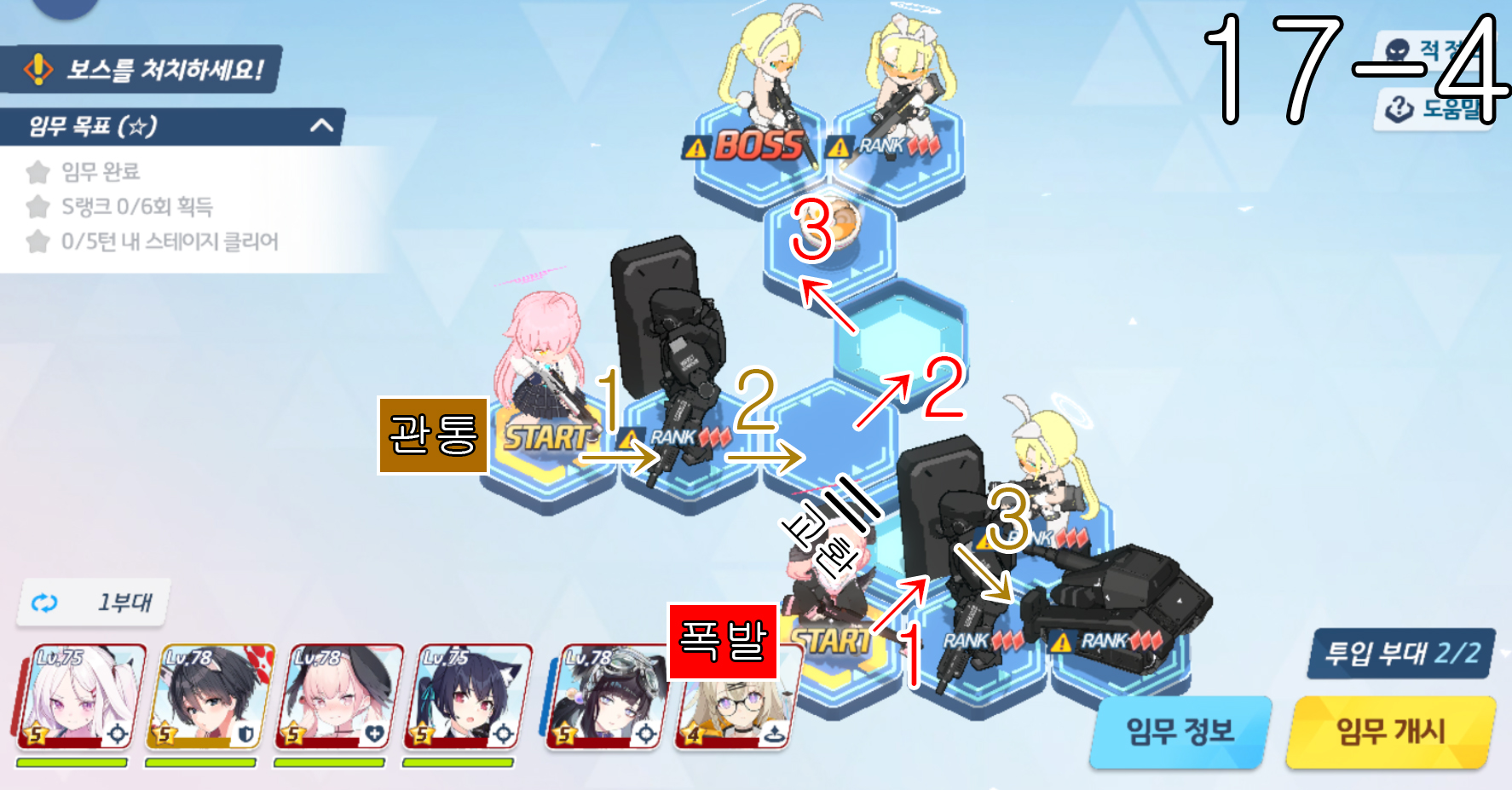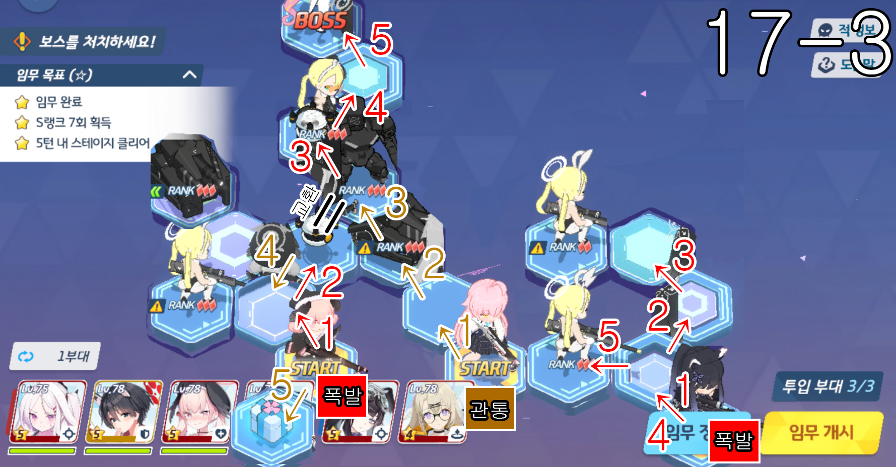 제 18지역 노멀 + 하드 노멀 노멀 18-1 주의사항 없음 노멀 18-2 주의사항 없음 노멀 18-3 주의사항 하루나 신비가 먼저 3번으로 이동을 하고 코하루 폭발과 교환하고 3번으로 이동한다. 노멀 18-4 주의