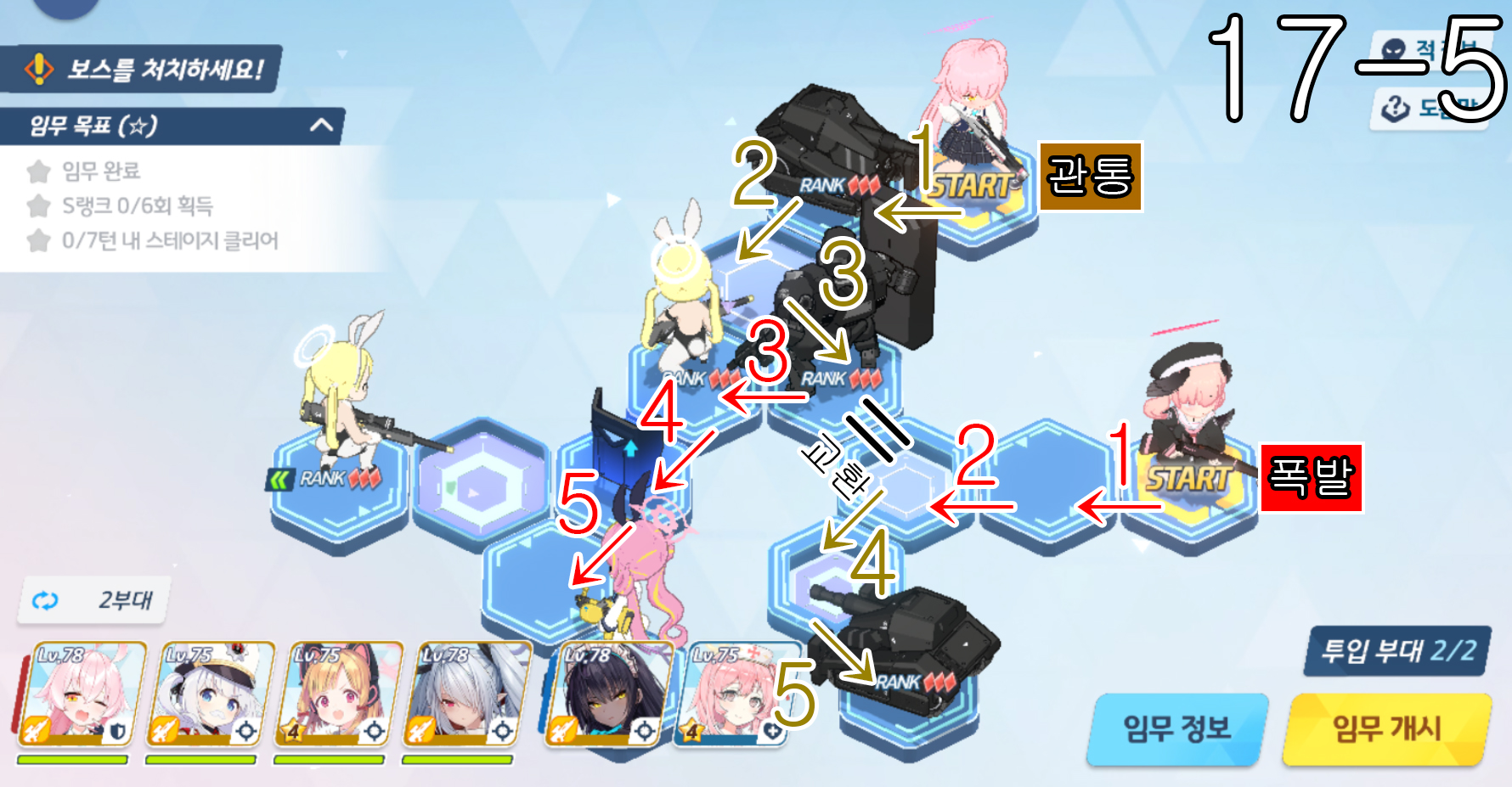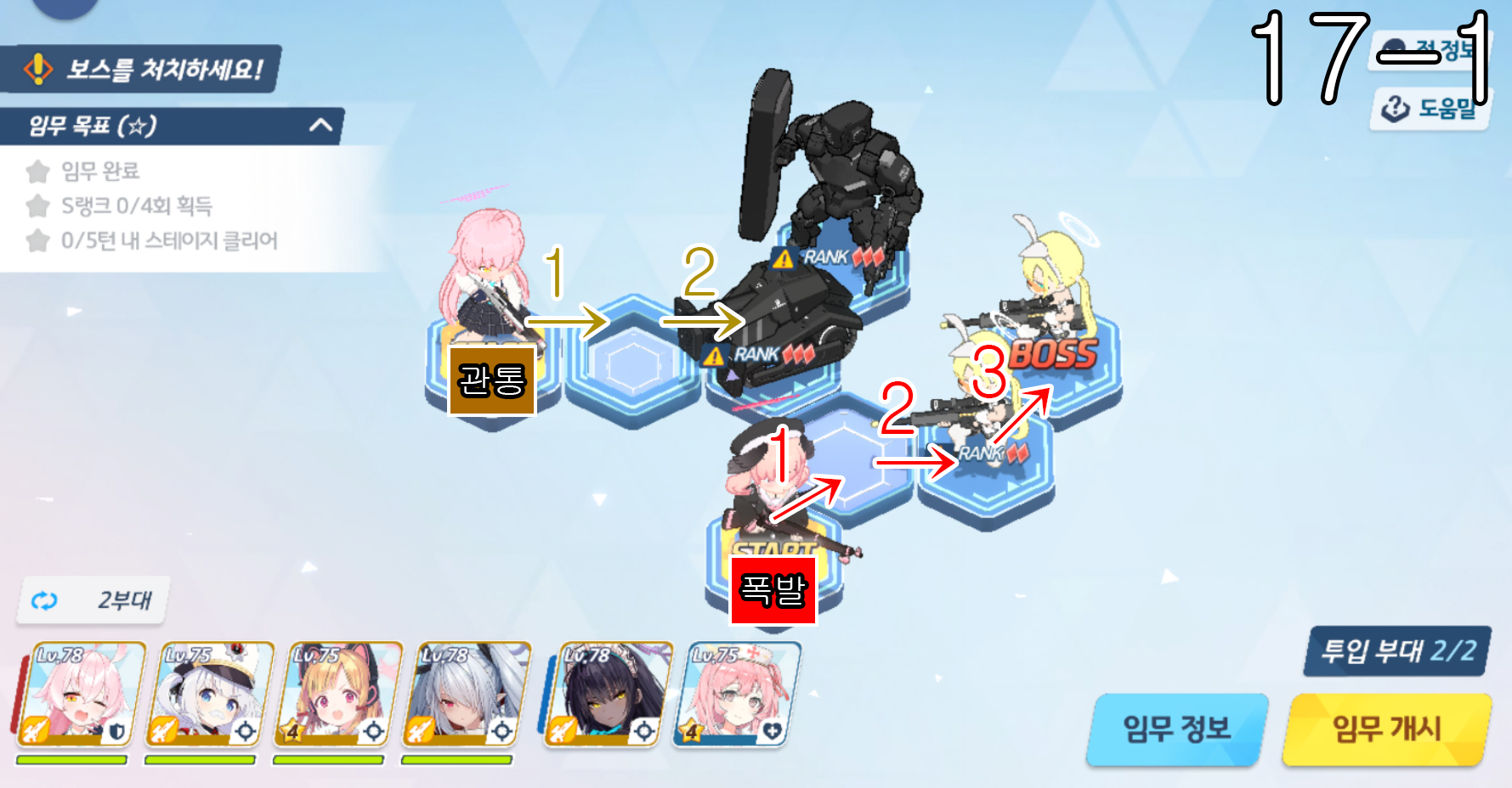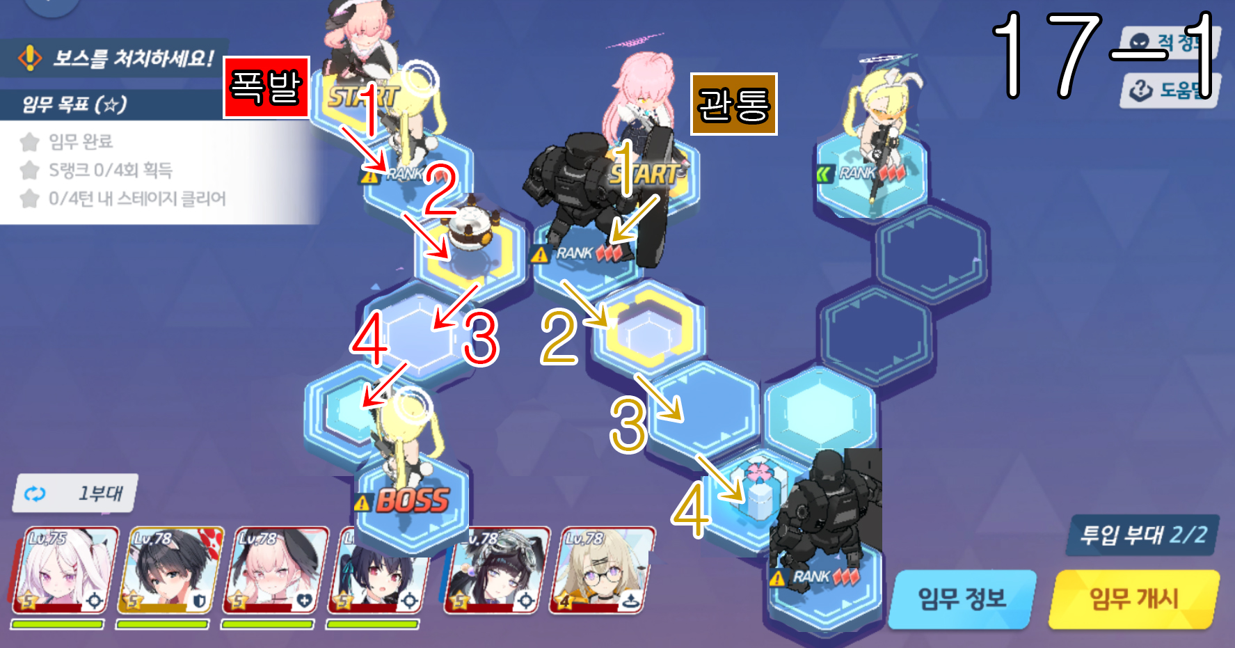 제 18지역 노멀 + 하드 노멀 노멀 18-1 주의사항 없음 노멀 18-2 주의사항 없음 노멀 18-3 주의사항 하루나 신비가 먼저 3번으로 이동을 하고 코하루 폭발과 교환하고 3번으로 이동한다. 노멀 18-4 주의