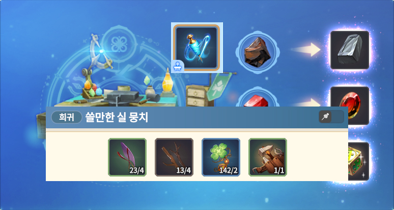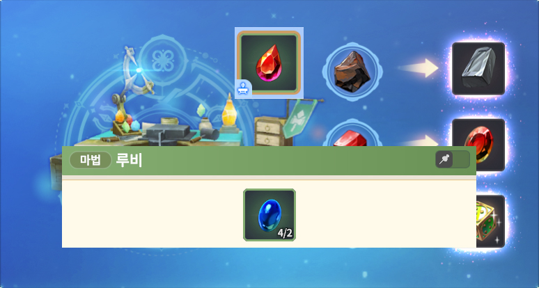 가공 LV3 레시피 미스릴 주괴 미스릴 광석 X 3 금 주괴 금광석 X 3 루비 루비 원석 X 3 아쿠아마린 아쿠아마린 원석 X 3 페리도트 페리도트 원석 X 3 일반 목재 튼튼한 나무줄기 X 1 나뭇가지 X 5 일반
