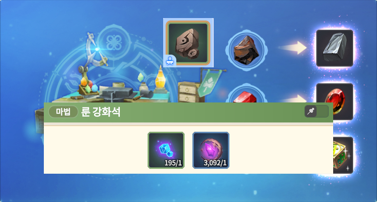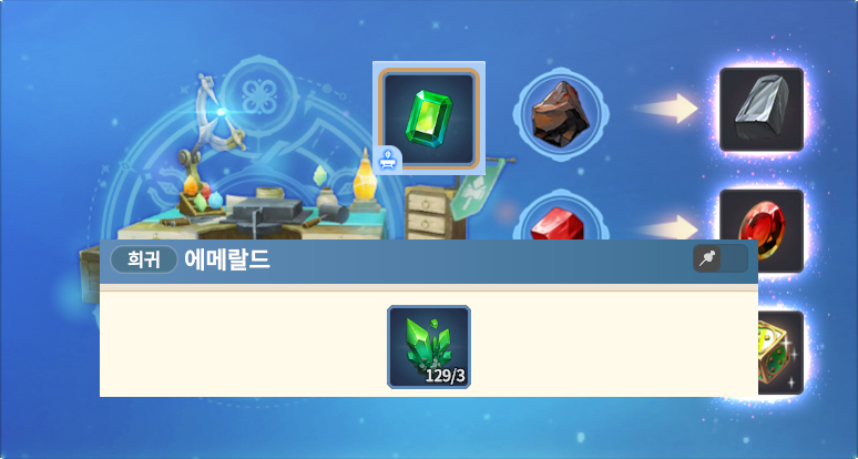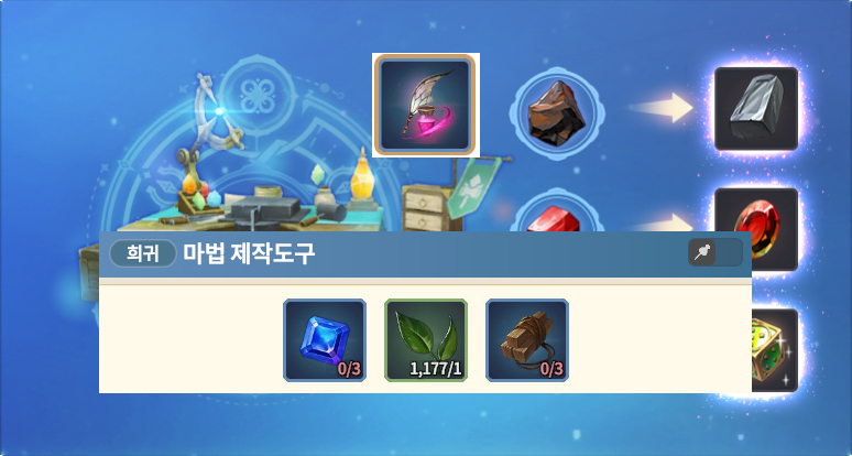 가공 LV4 레시피 플루라이트 주괴 플루라이트 광석 X 3 미스릴 주괴 금 주괴 X 2 (금광석3) 루비 아쿠아마린 X 2 (아쿠아마린 원석3) 쓸만한 실 뭉치 사프란 꽃잎 X 4 나뭇가지 X 4 네잎클로버 X 2 세공