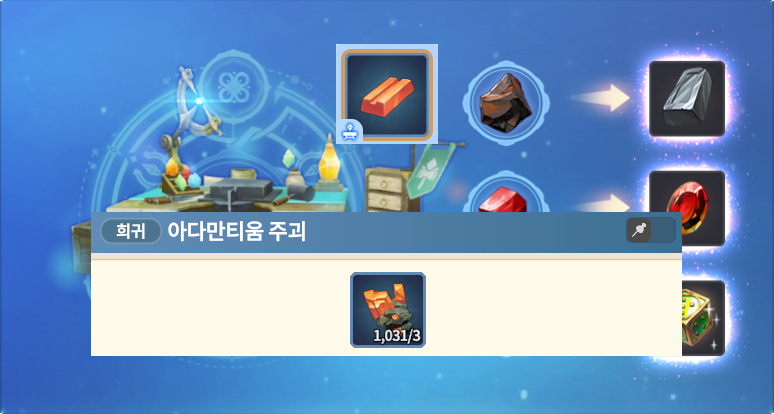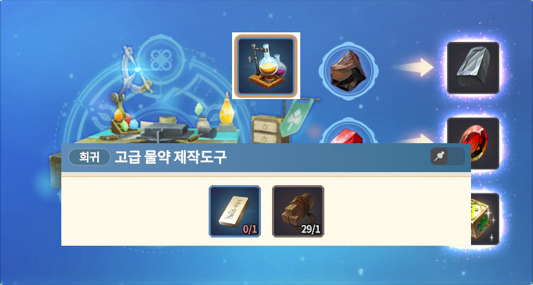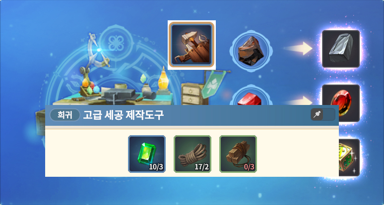 가공 LV6 레시피 트리튬 트리튬 광석 X 3 토파즈 토파즈 원석 X 3 아다만티움 주괴 백금 주괴 X 2 (백금 광석3 OR 달궈진 백금 광석2) 레드 다이아몬드 사파이어 x 2 (사파이어 원석3) 실 뭉치 세이지 잎