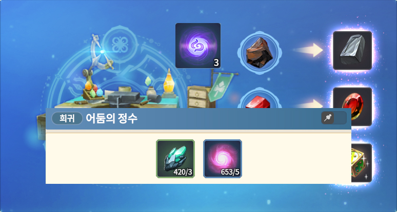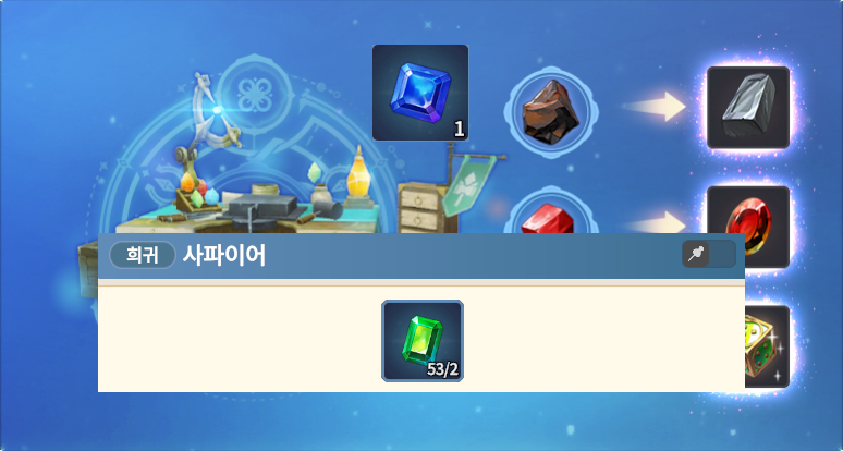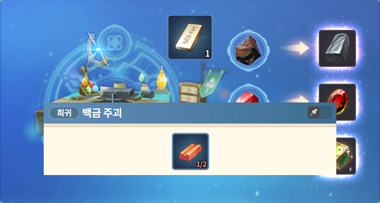 가공 LV6 레시피 트리튬 트리튬 광석 X 3 토파즈 토파즈 원석 X 3 아다만티움 주괴 백금 주괴 X 2 (백금 광석3 OR 달궈진 백금 광석2) 레드 다이아몬드 사파이어 x 2 (사파이어 원석3) 실 뭉치 세이지 잎
