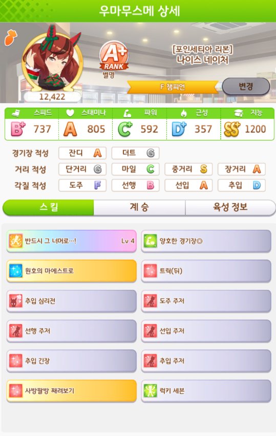 제가 제일 잘키운 메지로 맥퀸(12,822)점수로 7번인기였습니다.