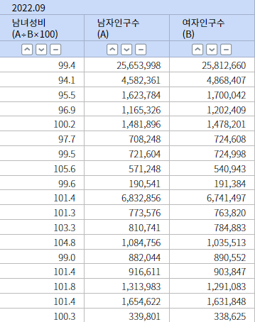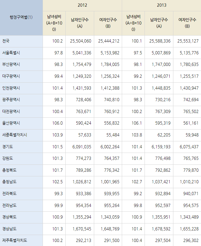 대한민국은 남녀 비율 100 : 100으로 사이좋게 생기면 좋겠습니다.