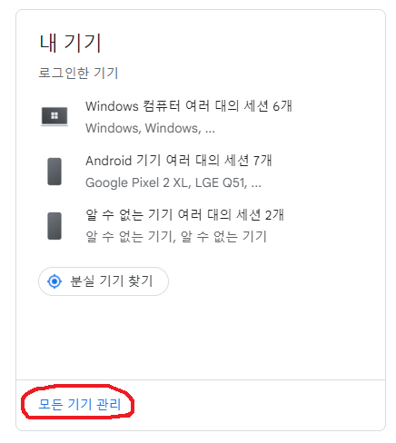 2. 구글 로그인 => 보안 => 내 기기 => 모든 기기 관리 =>