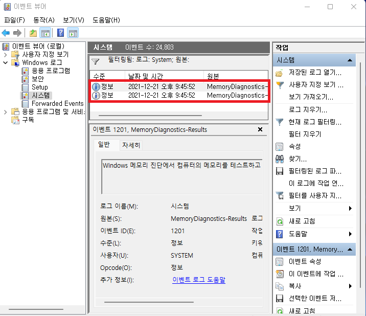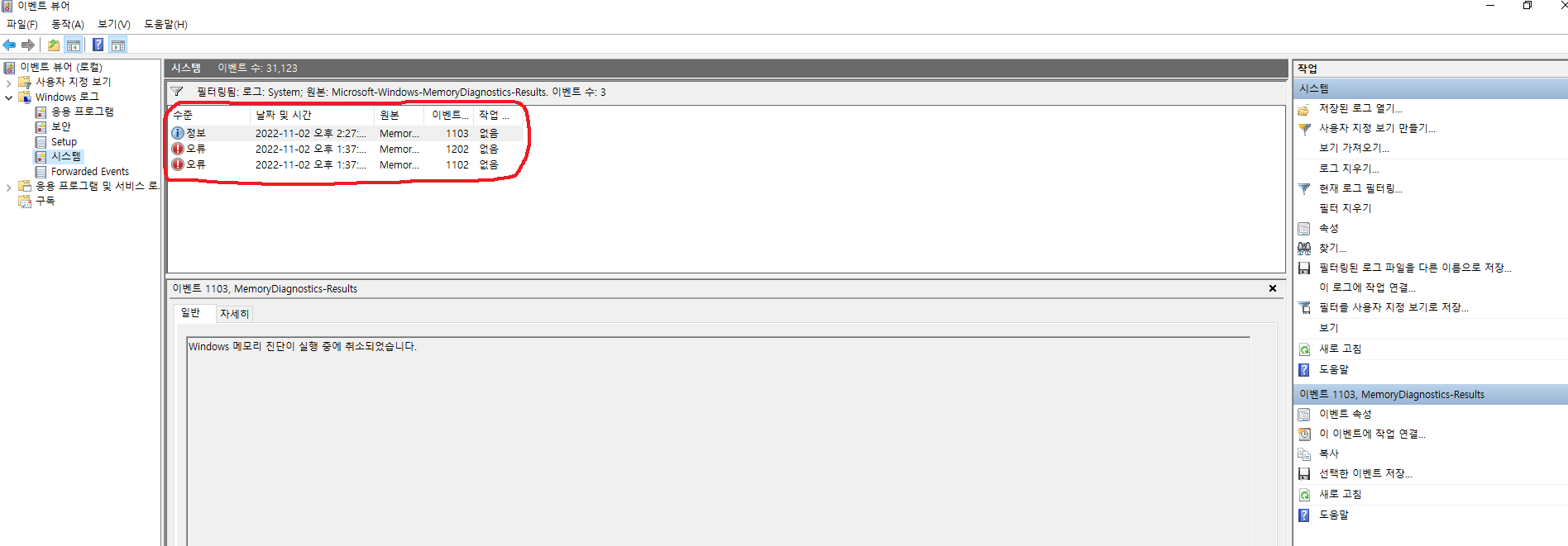 이벤트 뷰어 => Windows 로그 => 시스템 =>