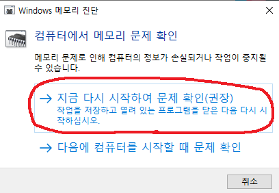 검색기 => 메모리 => Windows 메모리 진단 => 관리자 권한으로 실행