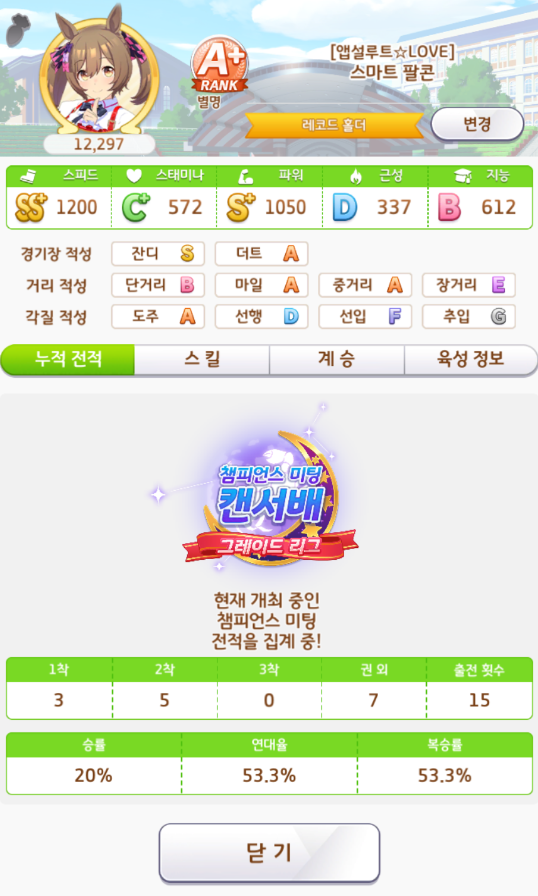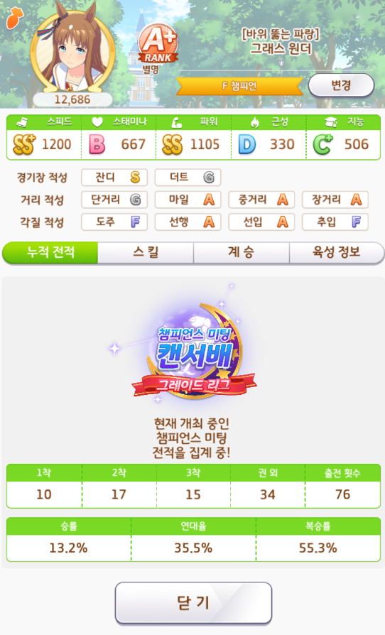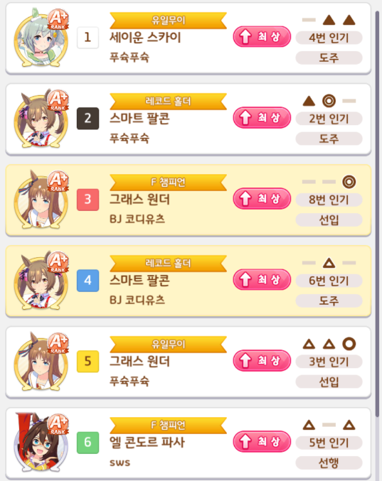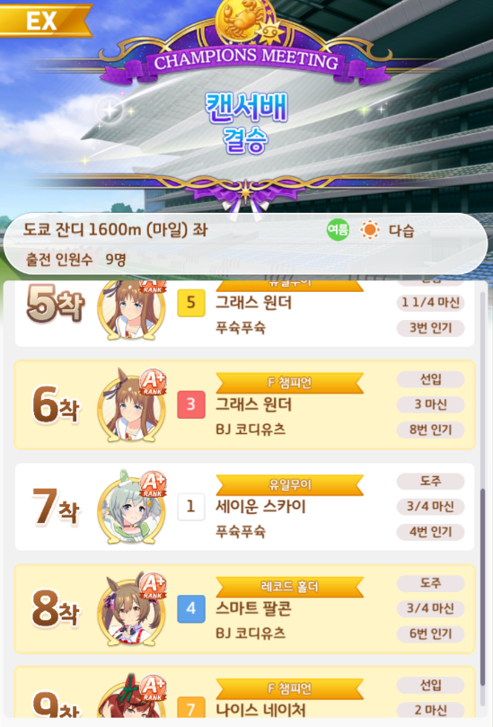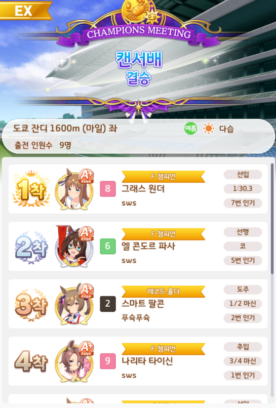 | 챔피언스 미팅 레오배 라운드1 A그룹 승률70% 달성 [우마무스메] (0) | 2022.12.13 |