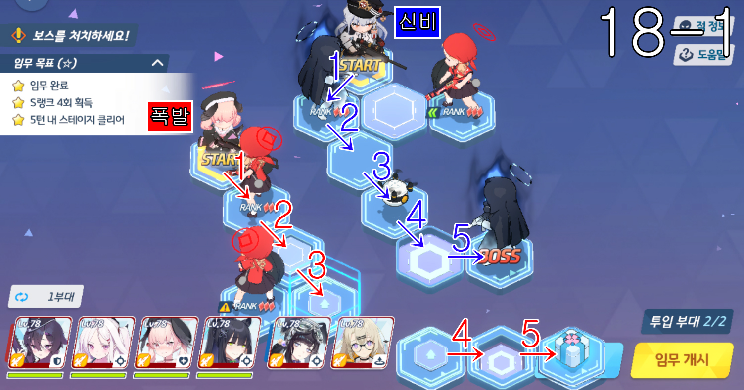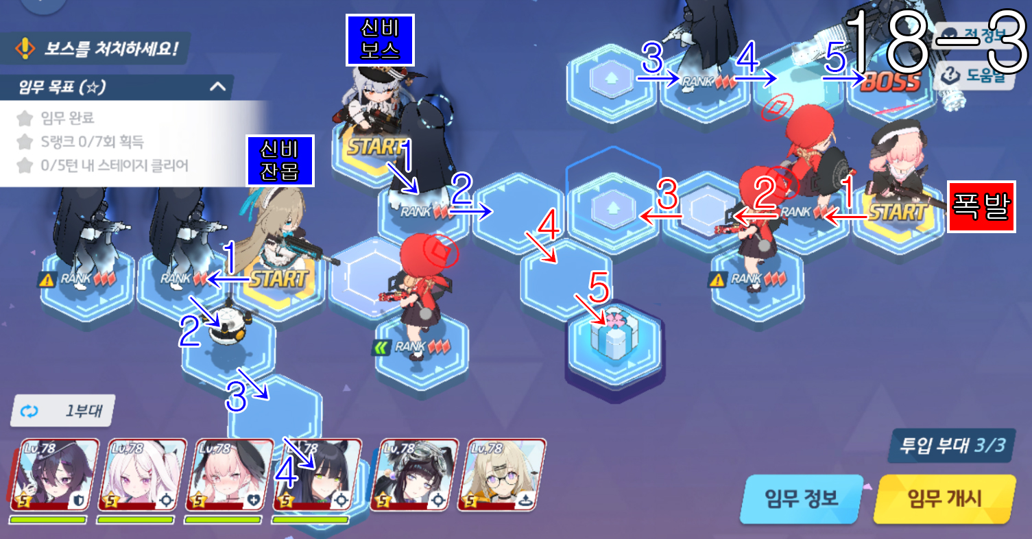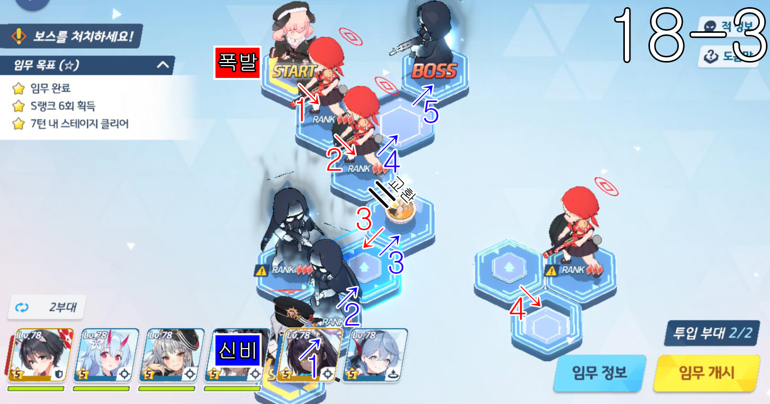 제 17지역 노멀 + 하드 노멀 노멀 17-1 주의사항 없음 노멀 17-2 주의사항 없음 노멀 17-3 주의사항 폭팔 3번 먼저 이동 후 관통 3번 이동 노멀 17-4 주의사항 관통 2번 먼저 이동 후 폭발과 교환 그리고