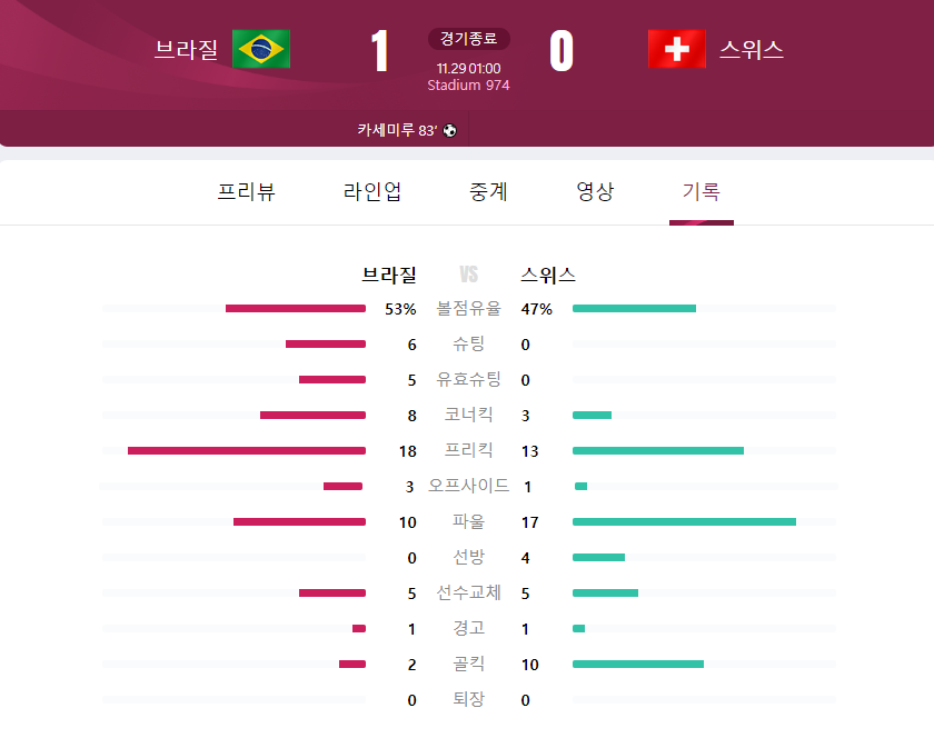 2022 카타르 월드컵 10일차 경기결과 네덜란드 2 VS 0 카타르 볼점유율 네덜란드 우세 슈팅 네덜란드 우세 유효슈팅 동점 코너킥 네덜란드 우세 프리킥 카타르 우세 오프사이드 카타르 우세 파울